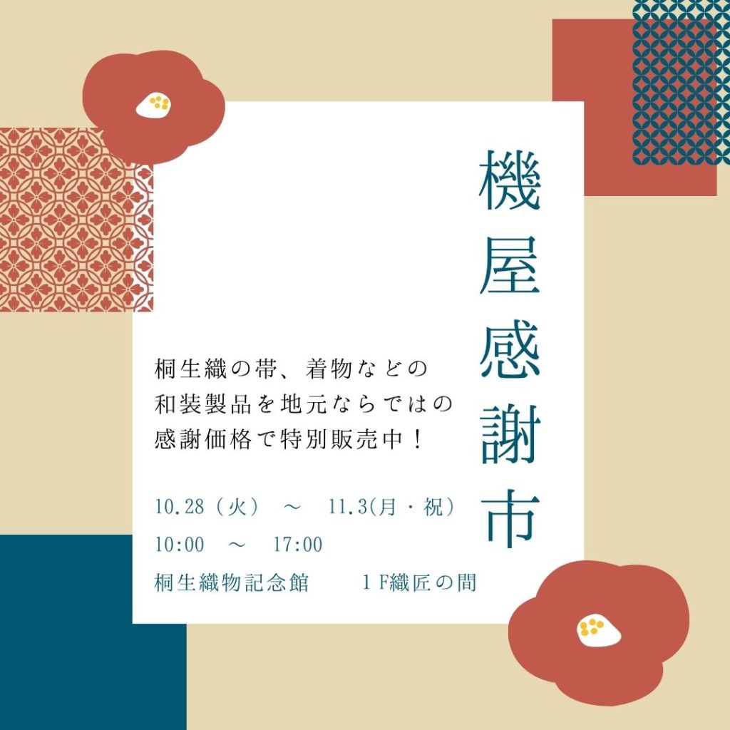 桐生織の帯、着物など和装の製品を地元ならではの感謝価格で特別販売する「機屋 感謝市」を桐生織物記念館の1F匠の間にて開催中です!